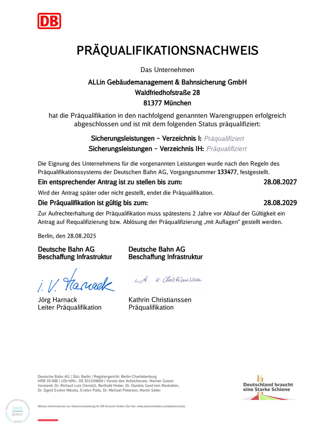 wir freuen uns, Ihnen mitzuteilen, dass unser Unternehmen die Prequalifikation der Deutschen Bahn im Bereich Sicherheit im Gleis erfolgreich abgeschlossen hat.